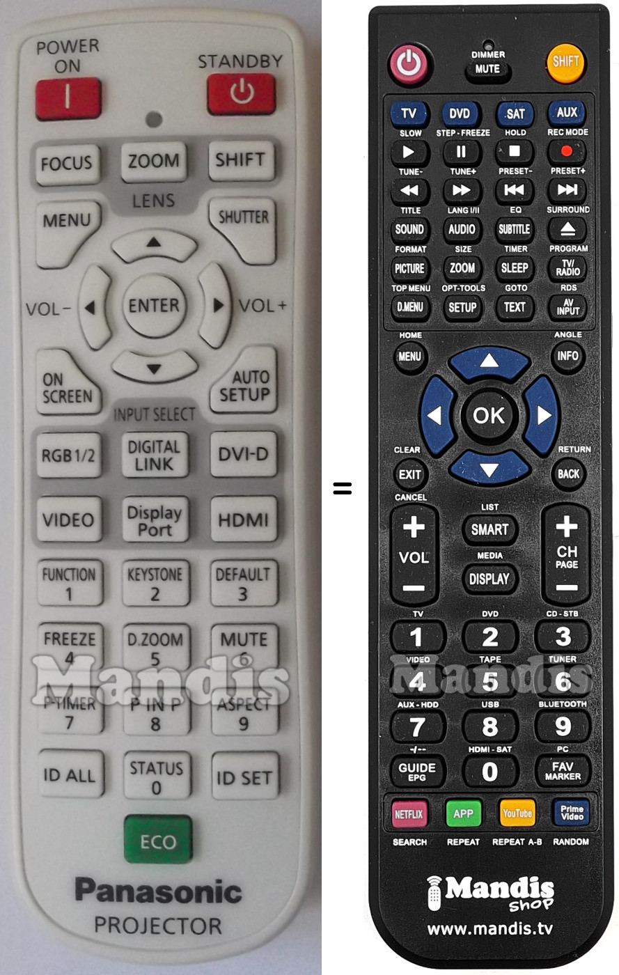 Cette télécommande remplit toutes les fonctions de la télécommande d'origine: Power On, Standby, Focus, Zoom, Shift, Menu, Shutter, On-Screen, Auto Setup, Enter, Up, Down, Right/ Vol+, Left/ Vol-, RGB 1/2, Digital Link, DVI-D, Video, Display Port, HDMI, 1/Function, 2/Keystone, 3/Default, 4/Freeze, 5/D.Zoom, 6/Mute, 7/P-Timer, 8/P IN P, 9/Aspect, 0/Status, ID ALL, ID SET, ECO