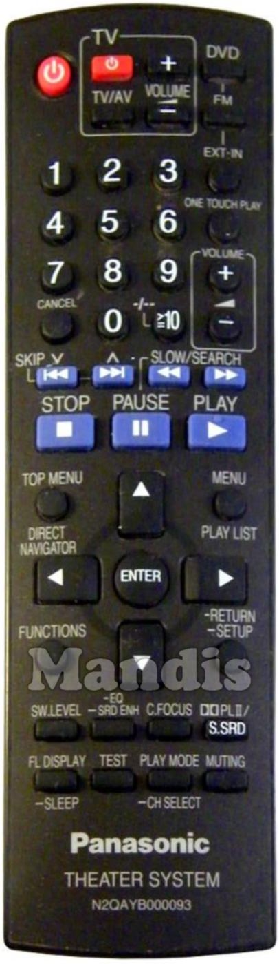 Power, TV Power, TV / AV, TV Volume+, TV Volume-, DVD, FM, Ext-In, One Touch Play, Volume+, Volume-, 1, 2, 3, 4, 5, 6, 7, 8, 9, 0, >= 10 / -/--, Cancel, I<<, >>I, <<, >>, Stop, Pause, Play, Top Menu / Direct Navigator, Menu / Play List, Up, Left, Enter, Right, Down, Functions, Return / etup, SW.Level, EQ / SRD ENH, C.Focus, S.SRD / PLII, FL Display / Sleep, Test, Play Mode / CH Select, Muting