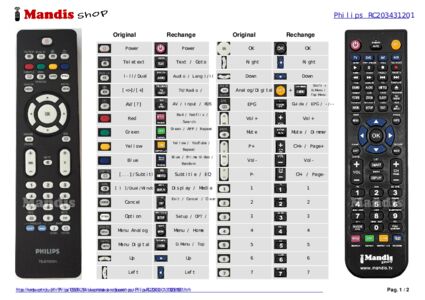 Cette télécommande remplit toutes les fonctions de la télécommande d'origine: Power, Teletext, Dual I / II, , AV, Red, Geen, Yellow, Blue, Subtitle, Dual Window, Cancel, Option, Menu Analog, Menu Digital, Up, Right, Down, Left, OK, Analog / Digital, EPG, Vol +, Vol -, Mute, P +, P -, 1, 2, 3, 4, 5, 6, 7, 8, 9, 0, Info, P<P / Back, Ambilight ON/OFF, Ambilight Mode, Sound, Picture