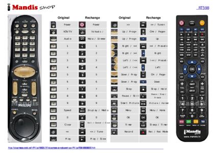 Cette télécommande remplace la plupart des fonctions de votre RT598 (996500000870). Il ne s'agit pas d'une télécommande universelle, mais d'une copie avec la plupart des touches et des fonctions de votre télécommande d'origine.
