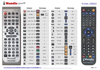 Cette télécommande remplit toutes les fonctions de la télécommande d'origine: Power Receiver, Sleep, Dimmer, Analog ATT, DVD / DVD 5.1, TV, DVR, Receiver, CD, CD-R, FM, AM, Standard, Adv. Surr, Stereo, Midnight / Loudness, Top Menu / Setup, Menu / Dialog E, Up, Left, Enter, Right, Down, Tuner Edit / S.Retriever, One Touch Copy / Return, Volume-, Volume+, Effect / CH. Sel, Level-, Level+, Mute, DVD/DVR Power, CH- / HDD, CH+ / DVD, Subtitle, << / Guide, Play / Rec, >>, Audio, I<< / Timer Rec, Pause / Info, Stop / Rec Stop, >>I / Jukebox, Display, Class, MPX, Tuning+, Tuning-, Station+, Station-, Shift