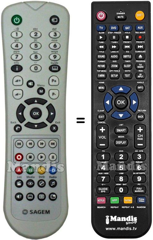 Ci-dessous, nous vous montrerons la correspondance entre chaque bouton de la télécommande d'origine et le bouton qui effectue la même fonction sur la télécommande de remplacement. Dans certains cas, vous devrez peut-être appuyer sur la touche SHIFT avant d'appuyer sur un autre bouton pour effectuer certaines actions. Ces fonctions supplémentaires sont souvent peu utilisées et sont incluses pour faciliter la compréhension de la télécommande de remplacement, ou parce que la télécommande d'origine comporte plus de boutons que son équivalent.
