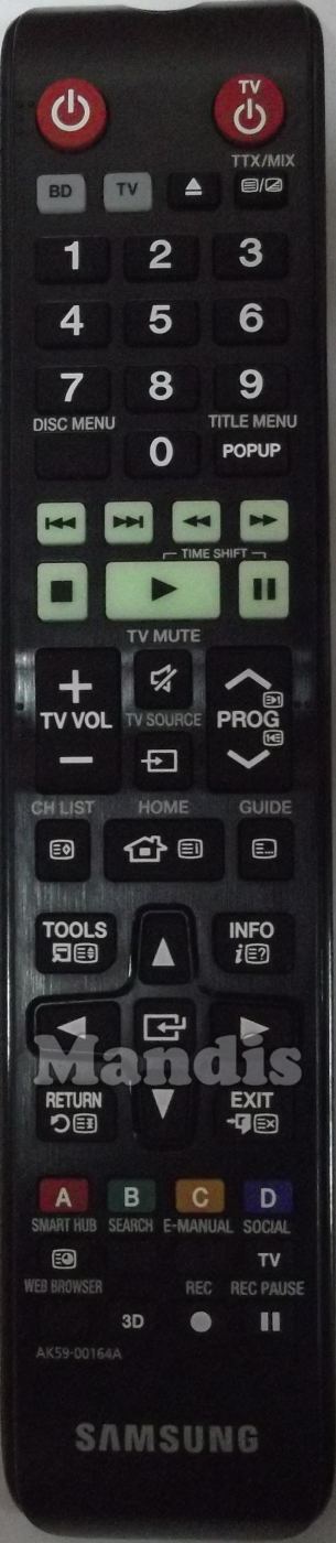 Power, Power Tv, Open/Close, TTX/MIX, 1, 2, 3, 4, 5, 6, 7, 8, 9, 0, Disc Menu, Popup/Title Menu, I<<, >>I, <<, >>, Stop, Pause/Timeshift, Play, Tv Vol+, Tv Vol-, Mute/Tv Mute, Source/Tv Source, Prog+, Prog-, CH List, Guide, Home, Tools, Info, Return, Exit, Up, Down, Right, Left, Enter, Red, Green, Yellow, Blue, Smart Hub, Search, E-Manual, Social TV, Web Browser, 3D, Rec, Rec Pause