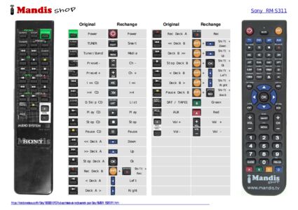 Attention : Cette télécommande remplace la plupart des fonctions de votre RM-S311 (169313111), mais pas toutes. Les fonctions principales sont incluses, mais certaines fonctions secondaires peuvent ne pas être disponibles.