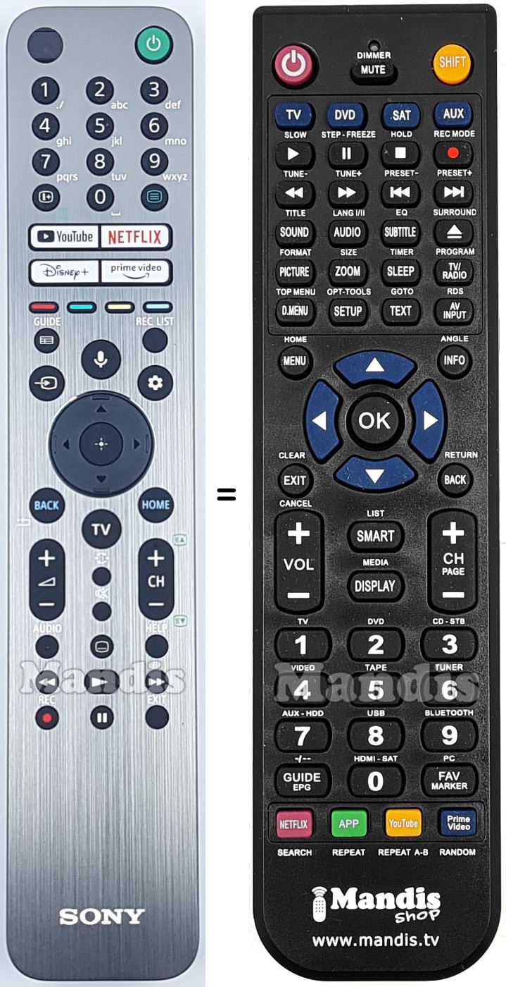Ci-dessous, nous vous montrerons la correspondance entre chaque bouton de la télécommande d'origine et le bouton qui effectue la même fonction sur la télécommande de remplacement. Dans certains cas, vous devrez peut-être appuyer sur la touche SHIFT avant d'appuyer sur un autre bouton pour effectuer certaines actions. Ces fonctions supplémentaires sont souvent peu utilisées et sont incluses pour faciliter la compréhension de la télécommande de remplacement, ou parce que la télécommande d'origine comporte plus de boutons que son équivalent.