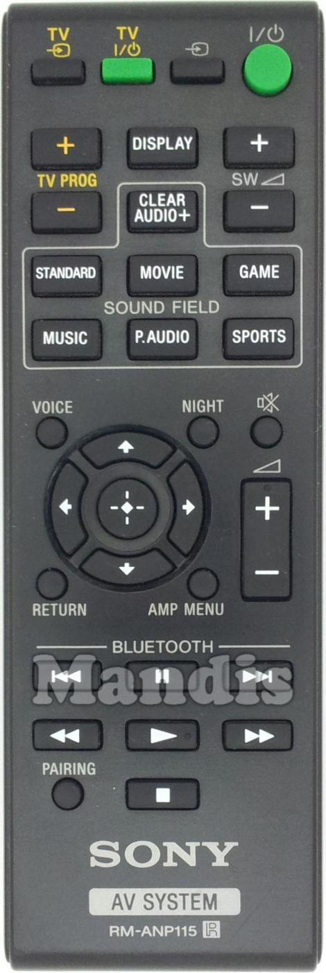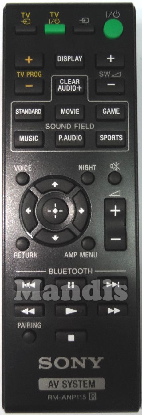Power, Input, Power TV, Input Tv, Tv Prog+, SW Vol+, Tv Prog-, SW Vol-, Display, Clear Audio+, Standard, Movie, Game, Music, P.Audio, Sports, Voice, Night, Mute, Vol+, Vol-, Return, AMP Menu, Up, Down, Right, Left, OK, I<<, Pause, >>I, <<, Play, >>, Stop, Pairing