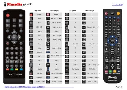 Cette télécommande remplace entièrement votre TCT2100 et offre toutes les fonctions de l'originale.