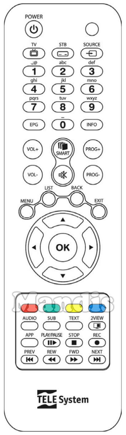 Power, TV, STB, Source, 1, 2, 3, 4, 5, 6, 7, 8, 9, 0, EPG, Info, Vol+, Vol-, Smart, Mute, Prog+, Prog-, Menu, List, Back, Exit, Up, Left, OK, Right, Down, Red, Green, Yellow, Blue, Audio, SUB, Text, ◨ 2View, APP, Play / Pause, Stop, Rec, I<< PREV, << REW, >> FWD, >>I Next