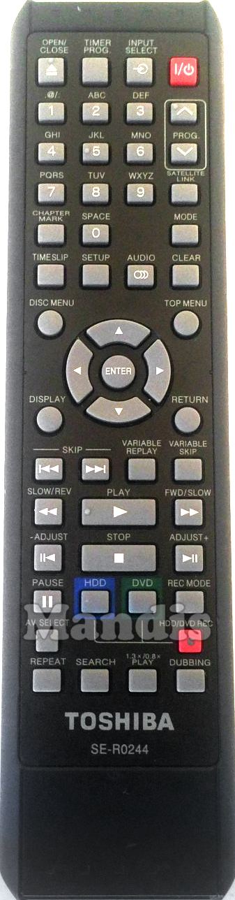 Power, Open / Close, Timer Prog., Input Select, 1, 2, 3, 4, 5, 6, 7, 8, 9, 0, Chapter Mark, Prog +, Prog -, Satellite Link, Mode, Time Slip, Setup, Audio, Clear, Disc Menu, Top Menu, Return, Display, Up, Down, Right, Left, Enter, I<< Skip, >>I Skip, Variable Replay, Variable Skip, << Slow / Rev, FWD / Slow >>, Play, Play reverse / Pause / Adjust -, Stop, Play / Pause / Adjust +, Pause, HDD, DVD, Rec Mode, AV Select, HDD / DVD Rec, Repeat, Search, 1.3x / 0.8x Play, Dubbing