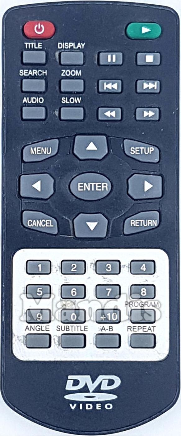 Power, Play, Title, Display, Search, Zoom, Audio, Slow, Pause, Stop, I<<, >>I, <<, >>, Menu, Setup, Cancel, Return, Up, Down, Left, Right, Enter, 1, 2, 3, 4, 5, 6, 7, 8, 9, 0, +10, Program, Angle, Subtitle, A-B, Repeat